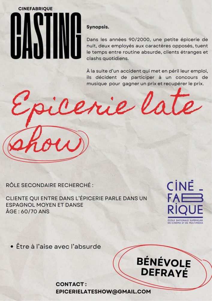 Dans le cadre d’un exercice de court métrage de première année dans l’école la Ciné-fabrique, sur le thème “comédie musicale” nous sommes à la recherche d’un ou d’une comédienne pour le rôle d’une cliente insolite d’une épicerie de nuit. Le tournage se fera à Lyon le mercredi 14 mai.