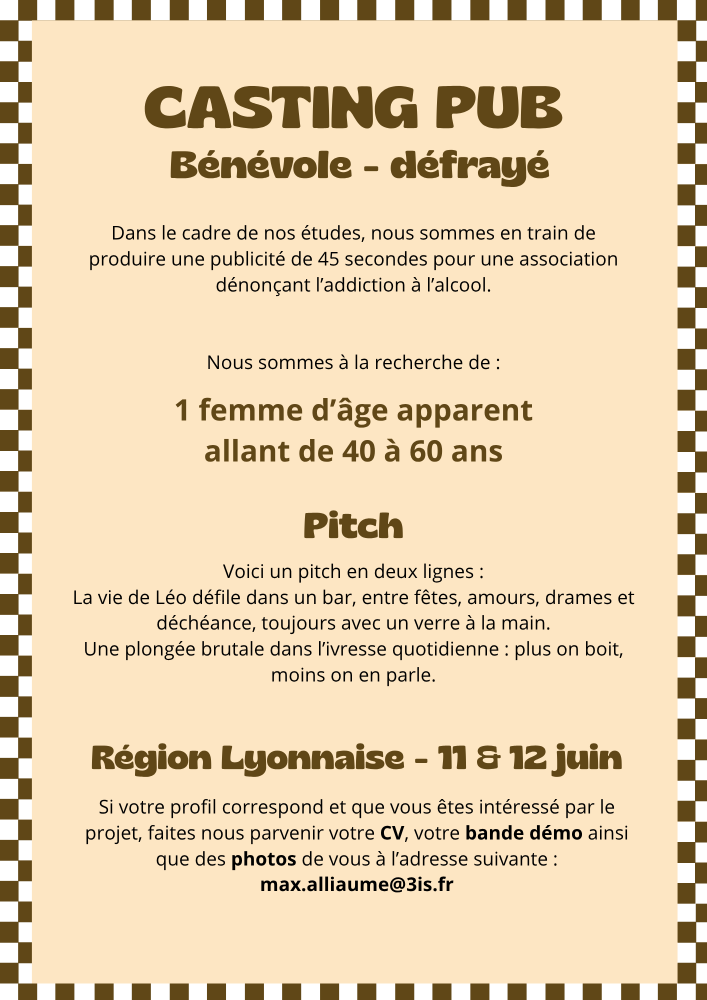 Bonjour, pour les besoins de la production d’une publicité pour une association luttant contre l’alcoolisme, nous sommes à la recherche de comédiens de différents profils.