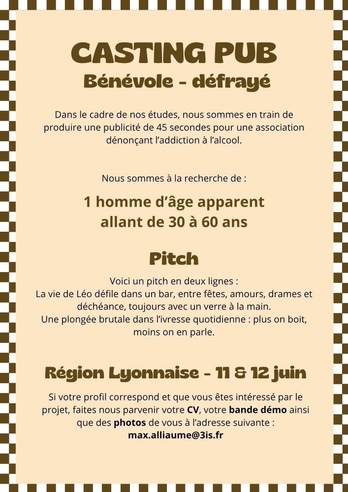 Nous sommes des étudiants en école d’audiovisuels, dans un cadre scolaire nous souhaiterons réaliser une pub de 45 secondes qui vise à sensibiliser sur la dépendance à l’alcool et ses dangers.